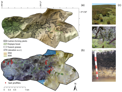 Within the Páramo ecosystem, elevation is the main driver for its vegetation, and this results in an internal vertical structure with three main Páramo vegetation belts: the sub-Páramo, the grass Páramo and supra-Páramo (Christmann and Oliveras, 2020). The summit and hillslopes feature well-drained soils covered by tussock grasses or bunch, constituting the grass Páramo. Whereas toeslopes and valley bottoms constitute permanently waterlogged areas covered by hard cushion-forming plants (Molina et al., 2024), such as sphagnum moss.